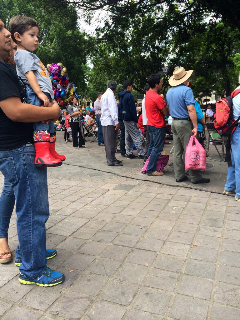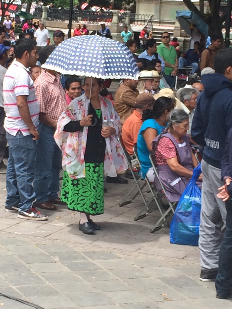 I crossed the zocalo to purchase some Oaxacan chocolate and got free samples while I was there. Then as I crossed back into the zocalo, I encountered an orchestra that had magically appeared! I enjoyed seeing all the different sorts of people who were enjoying the music–young, old, locals, and tourists. Of course, in the background I could also hear the chants of people involved in some sort of student protest.