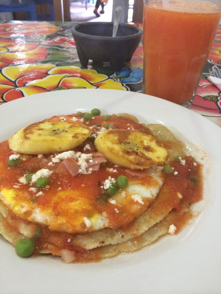 I don’t remember what this dish was called, but it was really good. Tortillas layered with beans, topped with fried eggs and fried banana.