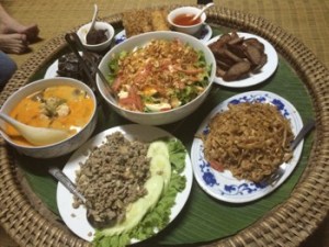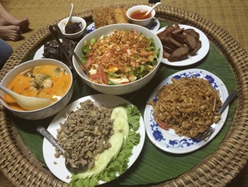 Next, the women left (it was past their bedtime) and Pilar, the woman of the house, greeted us. She had spent all day preparing our delicious meal, from a trip to the market in the morning to an afternoon in the kitchen cooking the food. We formed two circles on the floor, and her sons carried out two low tables covered with all sorts of food–Luang Prabang salad, chicken curry, fried eggplant, fried seaweed, and more! She also provided us with baskets of sticky rice. It was a little tricky to get used to eating with my plate on my lap, but I managed! We ate as much as we could, and then she brought out dessert–rice pudding with mango! All of the food was very delicious, and she was very kind to welcome us into her home.