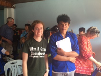The next morning, our host mother blessed us with bracelets similar to friendship bracelets. After breakfast, we met with four teachers from the local primary school. One was an English teacher, and although she did not start to learn English until college, she spoke very well. We learned that the children go to school five days a week, from 8-5, with an hour and a half break for lunch, which they have at home. The students study English two days per week in primary school, and also study Lao, math, and cultural studies. The teachers said that the biggest challenges they face are a lack of transportation, and the fact that many parents are unable to help their children at home. We donated our books that we purchased at Big Brother Mouse, and the teachers were very appreciative.