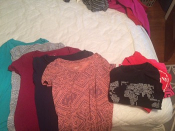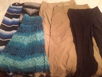 Myanmar stays kind of hot and humid, but shorts aren’t really worth bringing from what I have read. We will be spending so much time visiting temples and pagodas where you have to keep your knees and shoulders covered that I don’t think I would get much use out of a pair of shorts. So I am bringing two long skirts and two convertible type pants where I can zip off the legs and change them into shorts if I wish. The pants themselves are lightweight and one pair is even pretreated to repell mosquitoes! The black yoga pants are what I wear on the plane and they can also double as sleep pants for cooler nights. I threw in the blue skirt because it is lightweight and doesn’t take much space, but I am not sure that it is long enough to cover my knees.