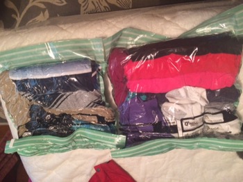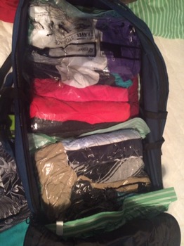 I like to use these vacuum seal bags to pack my clothes because it squeezes out all the air and packs the clothes down really tight. I packed all my clothes in these two bags and packed an extra, larger vacuum seal bag to put my dirty clothes in. I plan to wash my clothes at some point halfway through the trip.