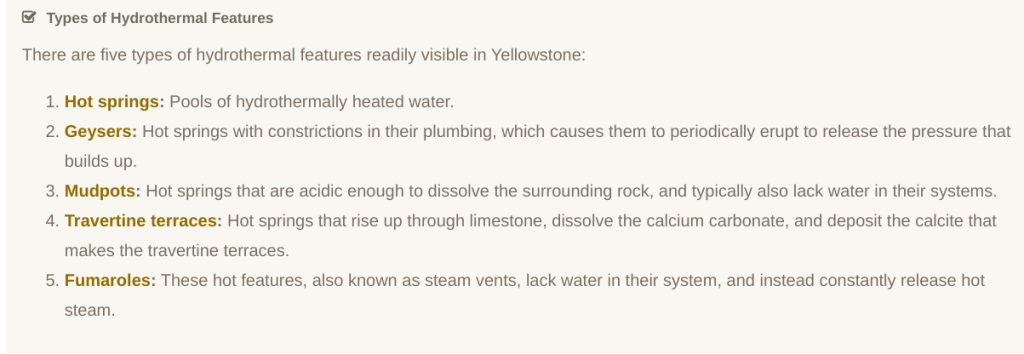 We learned that there are a variety of hydrothermal features, not just geysers. Here they are as explained on the National Parks Service website (click the link to read more):