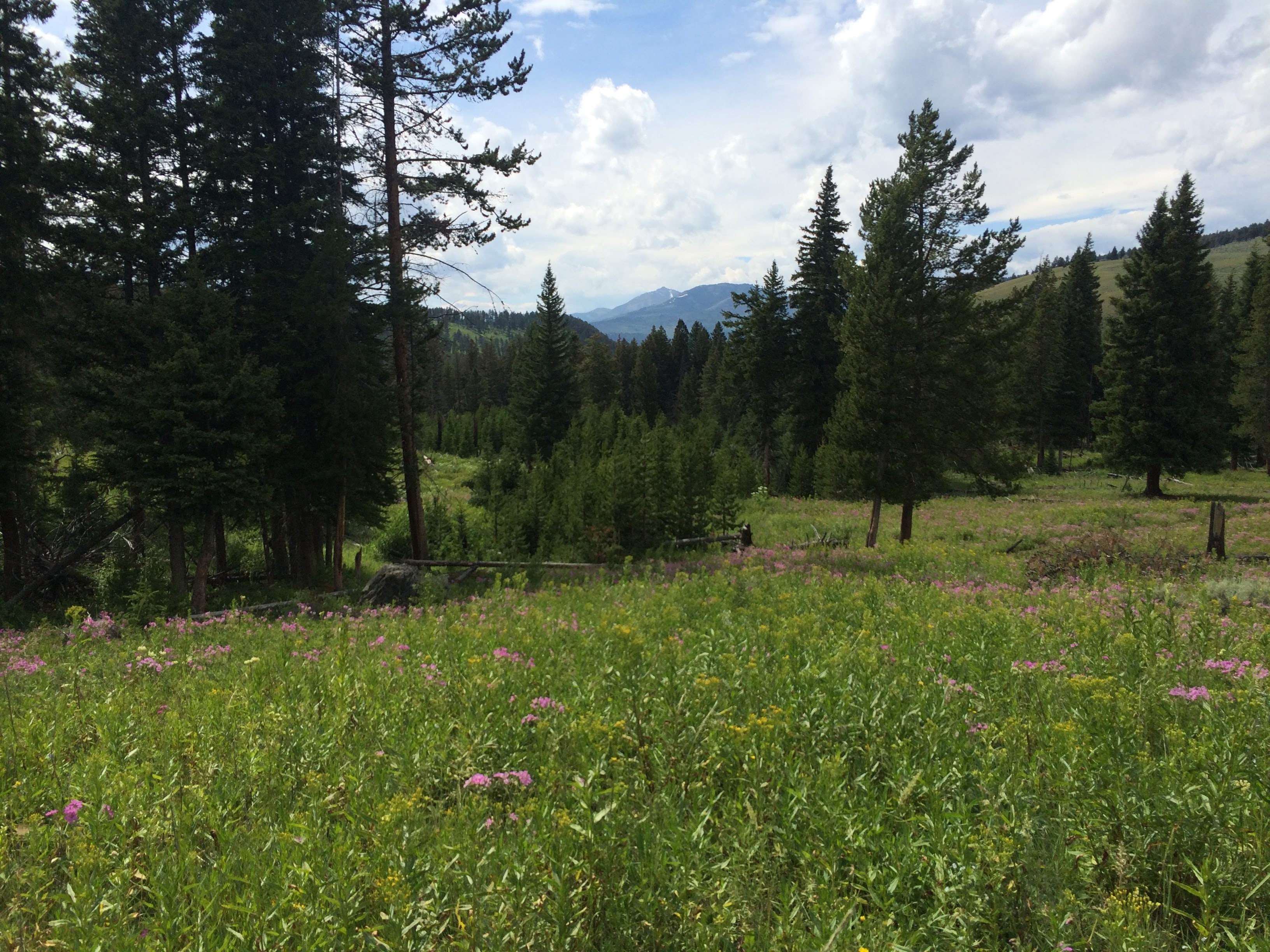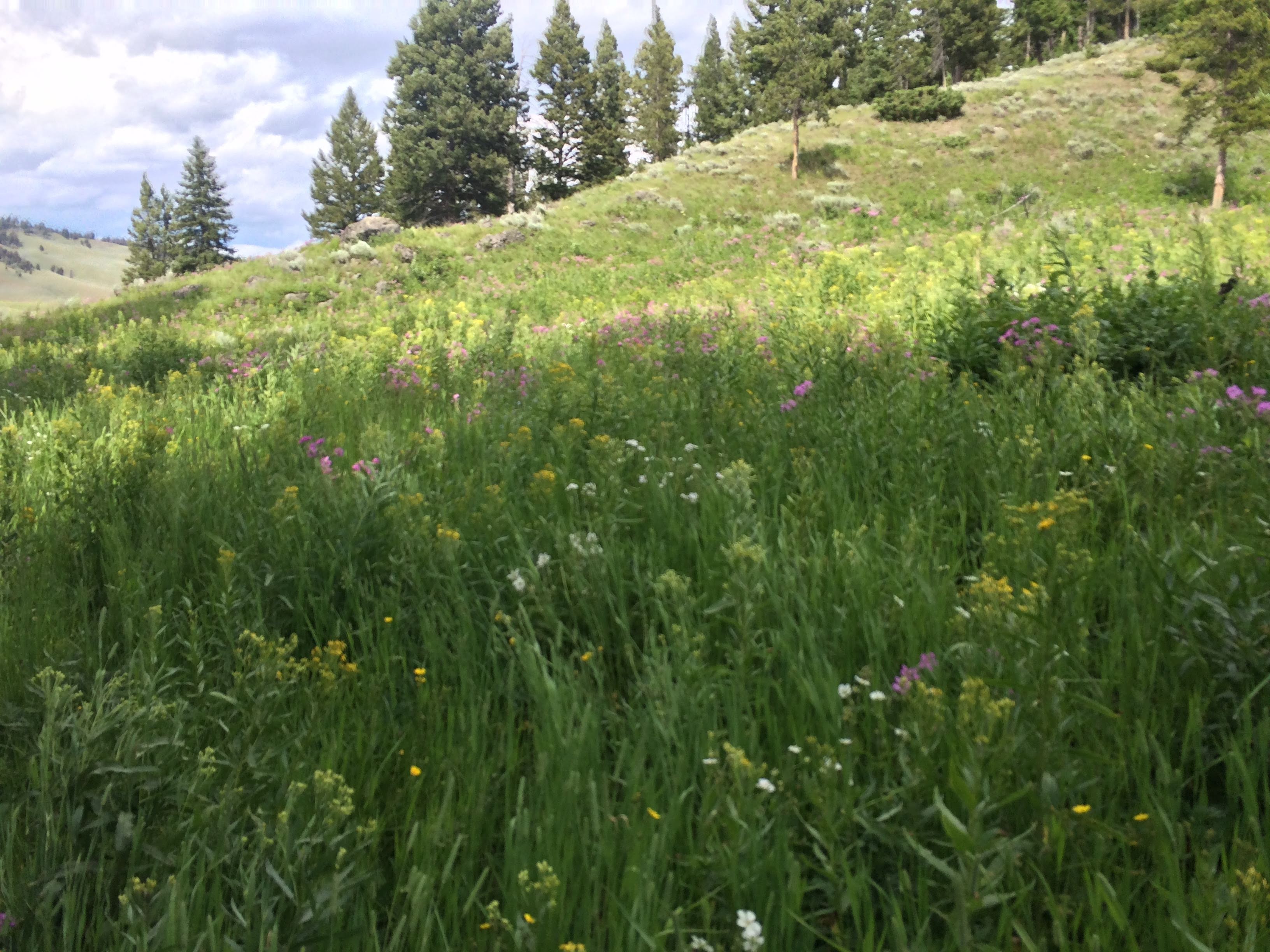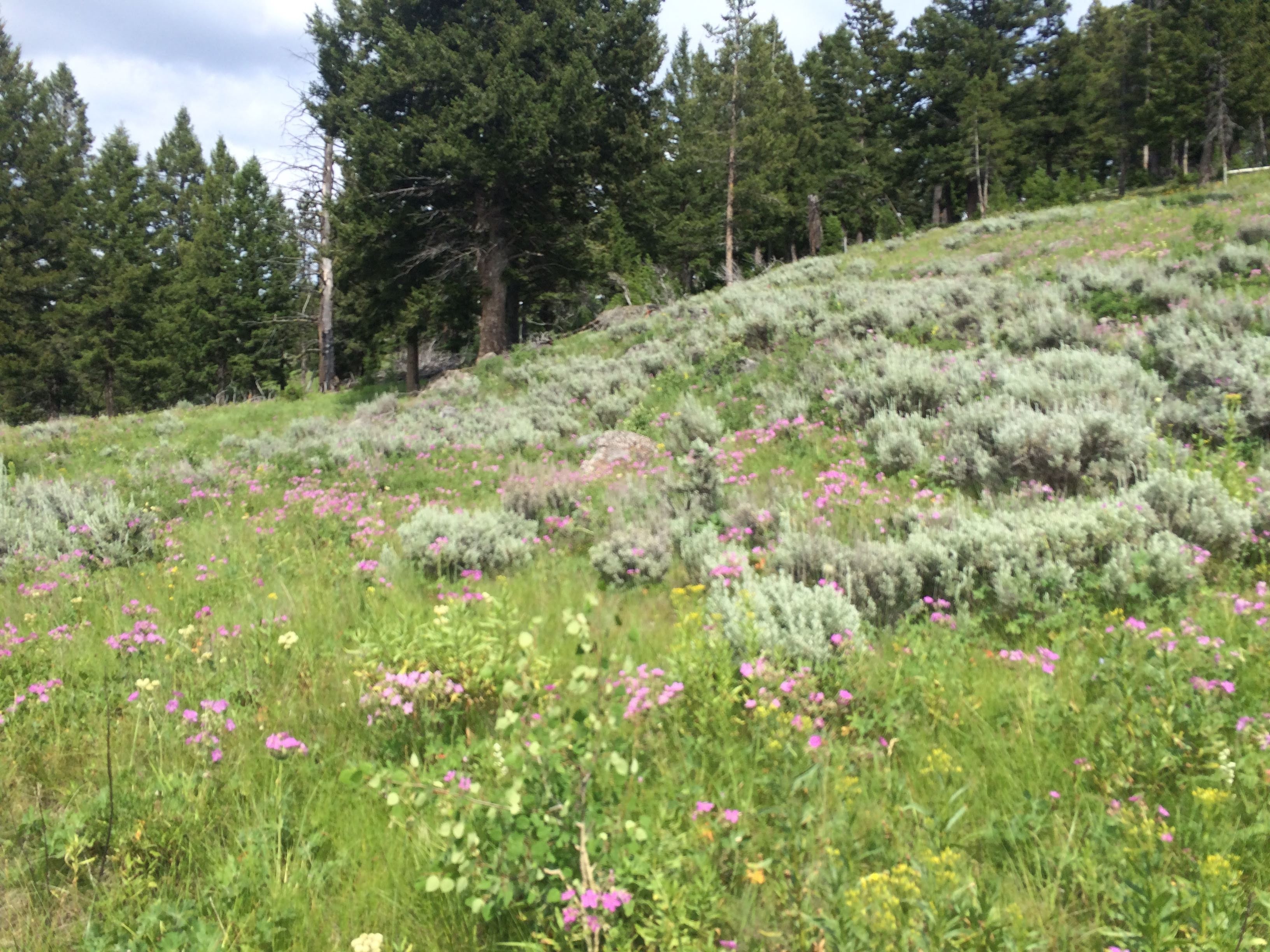 Finally, it was time to head towards the North Entrance, and out of the park. We did stop for photos along the way, including a stop at the petrified tree (which Ryan thought was hilarious) and a short hike where we viewed a lot of the wild sage and wildflowers. We intended to stop at Mammoth Hot Springs before heading out, but it was extremely crowded in that parking lot, and we decided if we wanted to make it back for the block party in Bozeman, we had better head out instead. However, we have a good sighting of a couple of hilarious elk as we left (which we originally thought were moose).