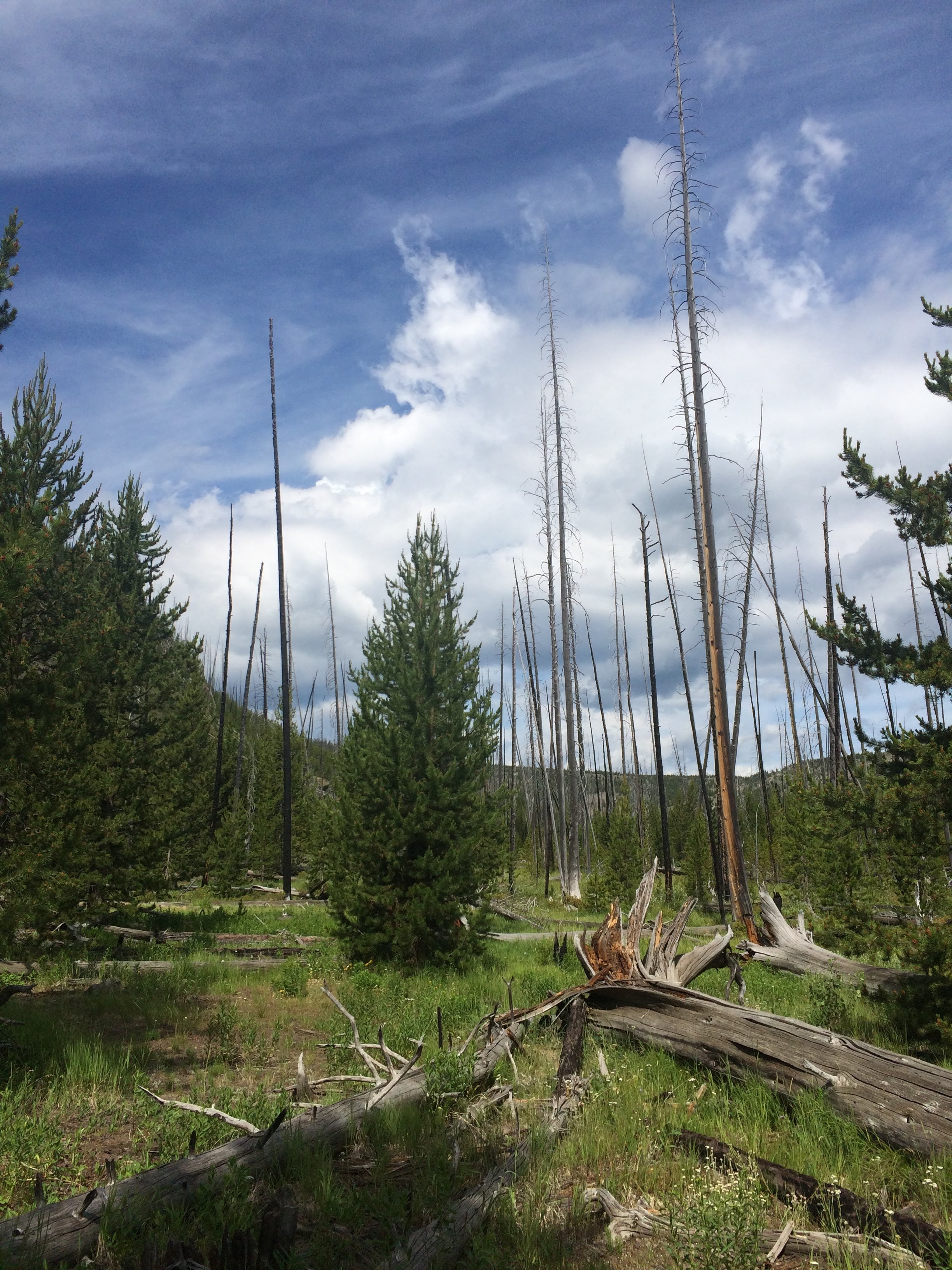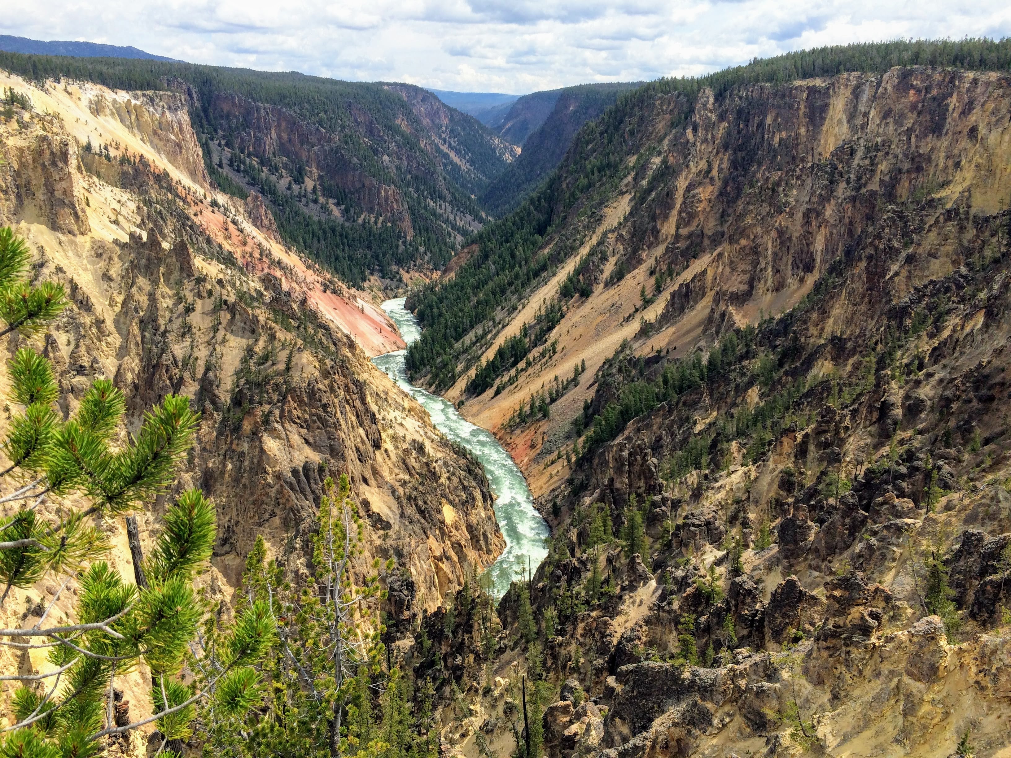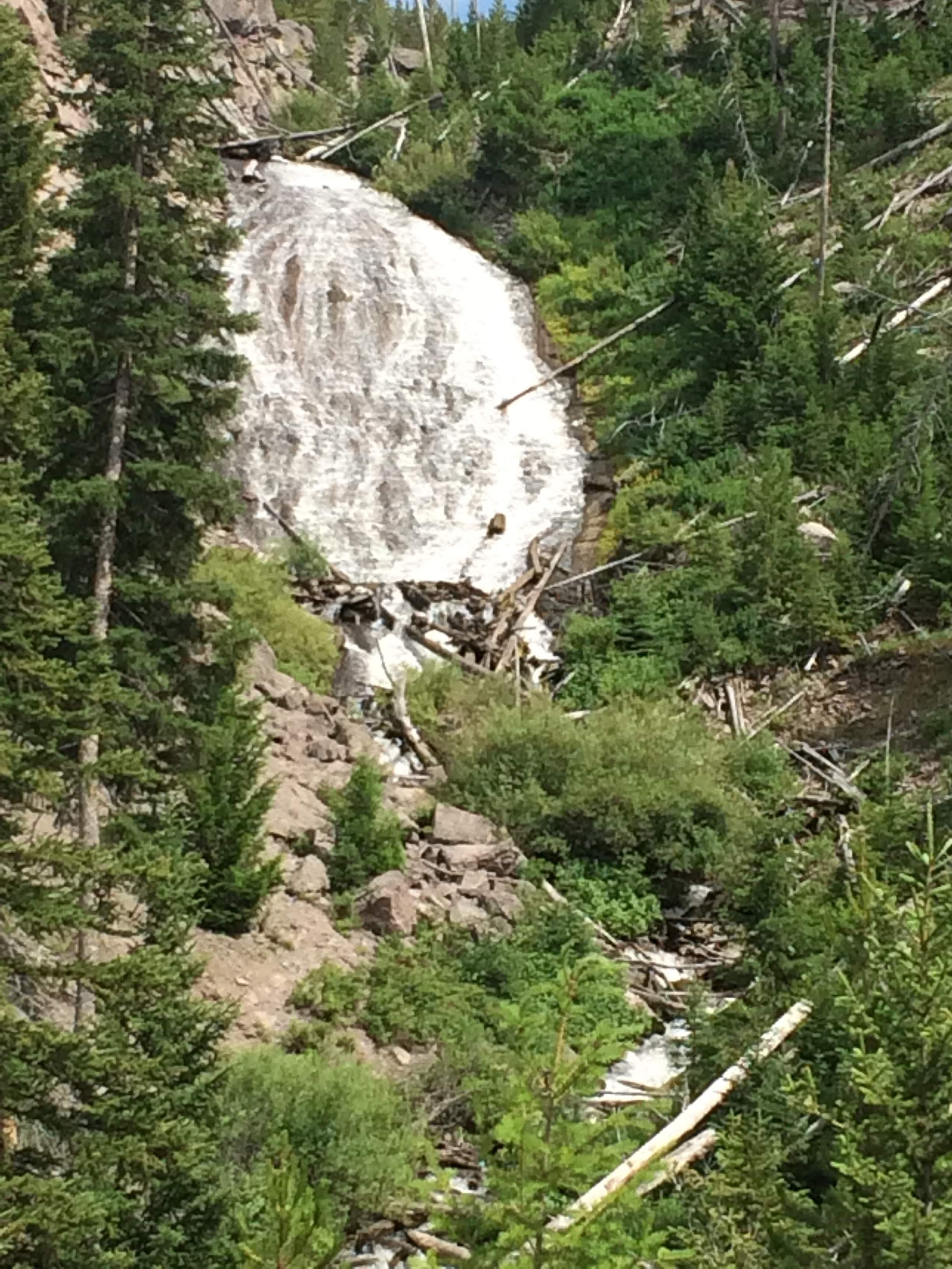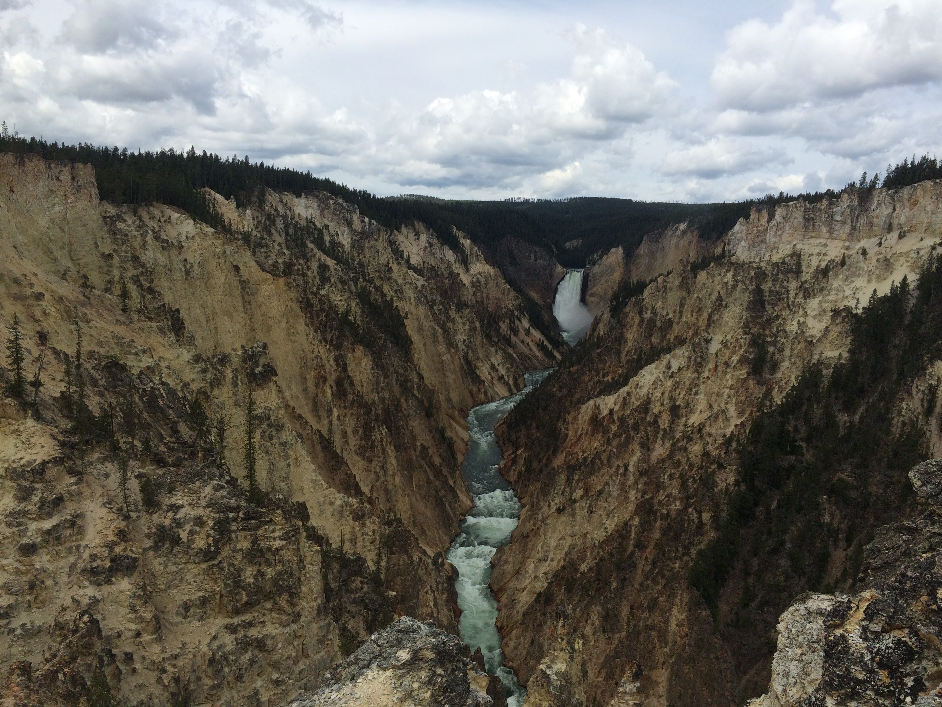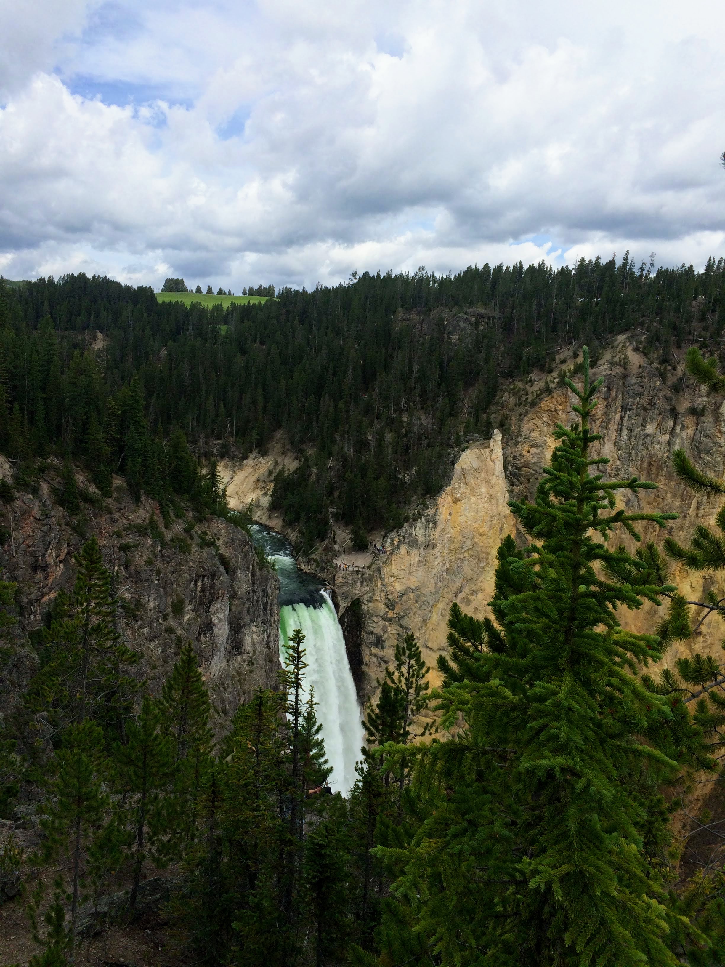 My breakfast in the morning was also good, but way too much food! I had huckleberry pancakes (because huckleberries are everywhere). We checked out of our cabin and then decided to find a good trail before starting to head back to Bozeman. I was interested in seeing the Grand Canyon of Yellowstone, so a ranger at the visitor center recommended doing part of the North Rim Trail. It was definitely an interesting hike, with a lot of different scenery along the way, including the canyon, falls, and fumaroles. For the first part, we were hiking along with lots of other people who wanted to get great views of the falls, but after Artist’s Point, we started seeing fewer and fewer people. Eventually, we were on our own walking down a shortcut path to get back to the trail head, when we noticed some trees that looked like bears had been scratching them! We were sure glad we rented cans of bear spray, and we started talking and singing very loud on that last stretch of trail. We made it out safely without any bear encounters, though, and were able to return our bear spray unused!