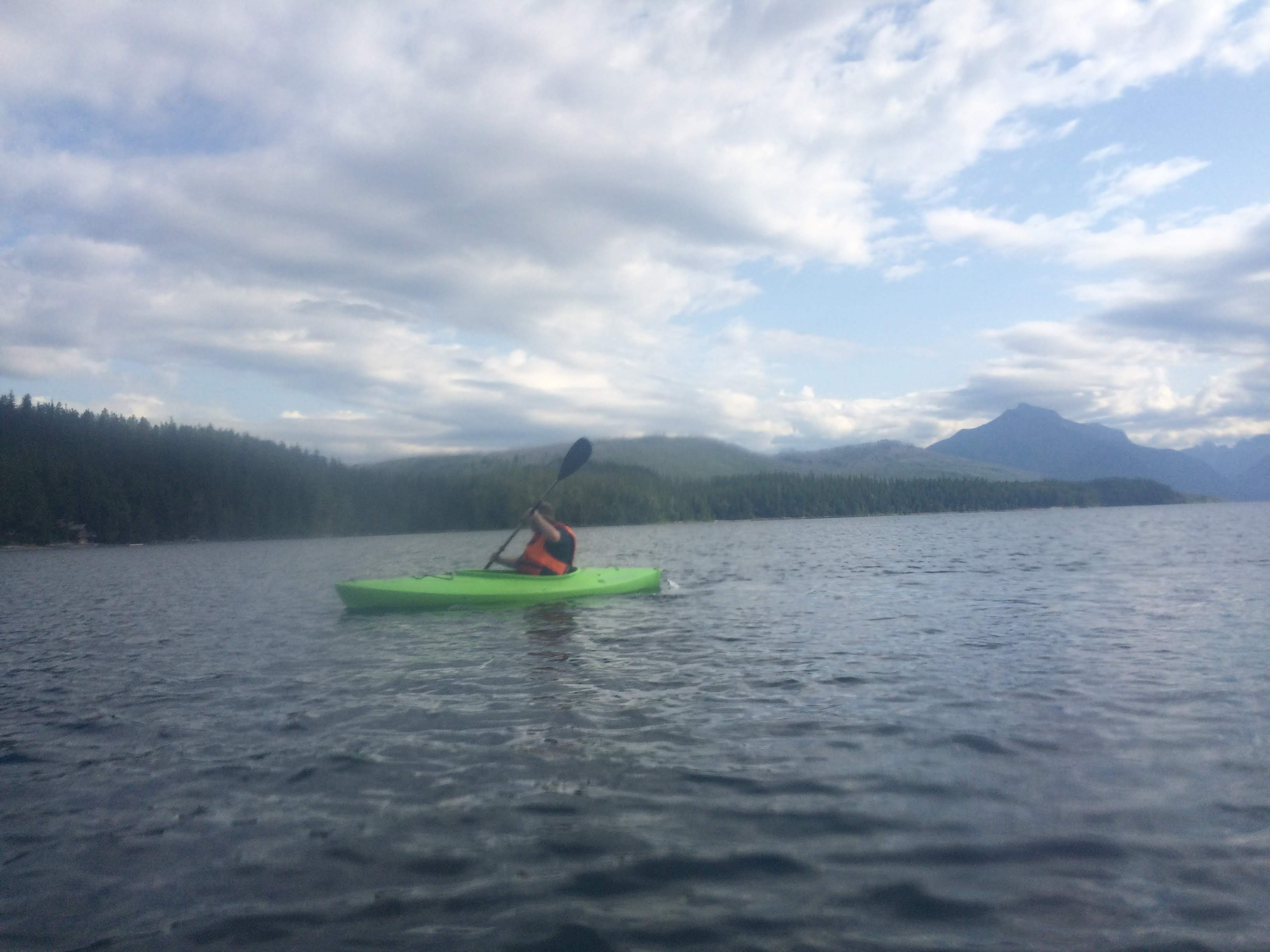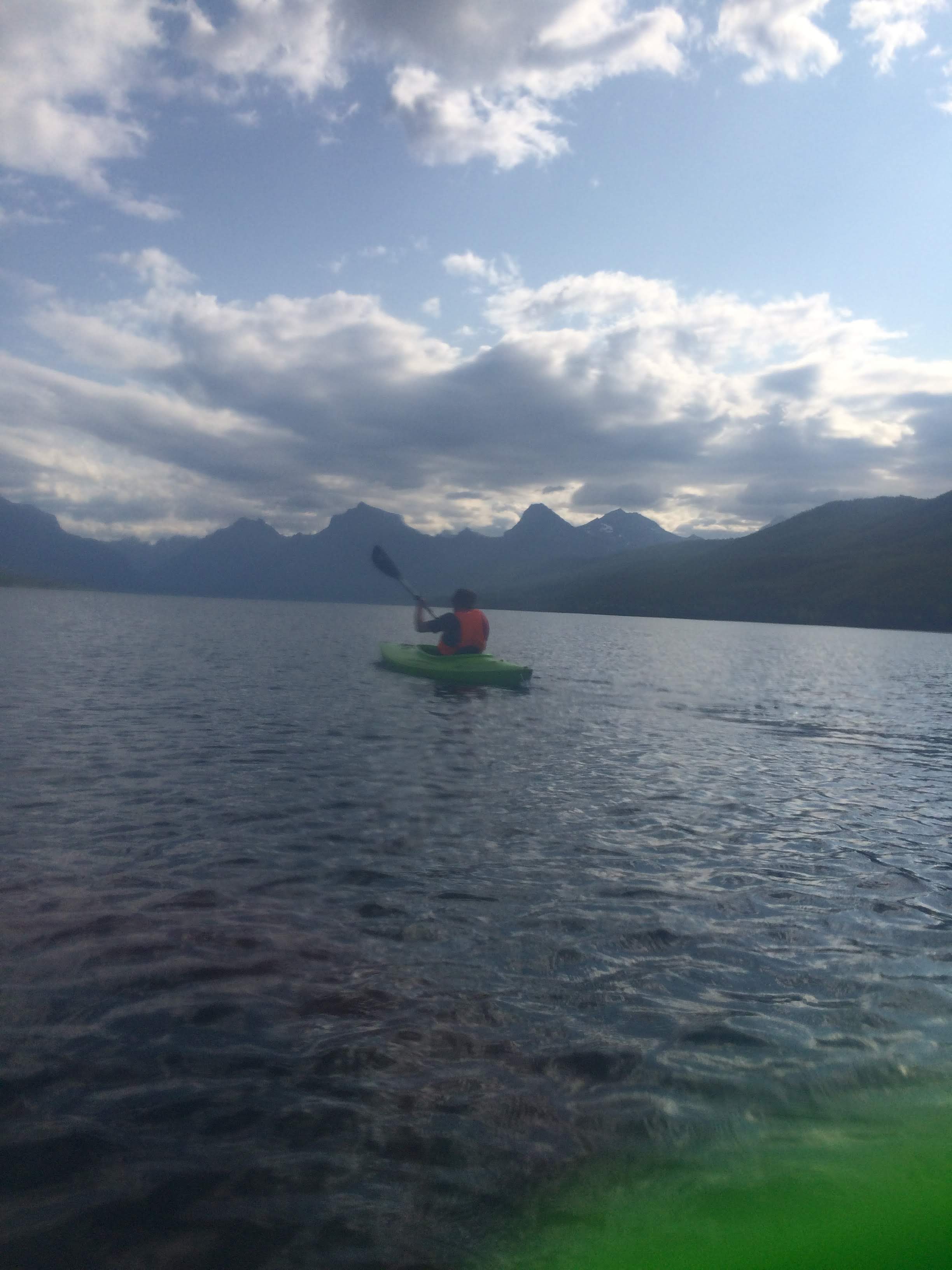 The following day, we drove back to Glacier for a day of exploration. Our plan was to kayak at Lake McDonald in the morning, and then take a famous Red Bus tour in the afternoon on the Going-to-the-Sun road. We got there early, and we were the first people at the kayak rental booth. We were instructed to always wear our neon-colored jersey over our PFD in order for the boat crew to be able to keep an eye on us more easily from shore. Then we were told how far we were allowed to venture out, and what kinds of sights to look for along the way.