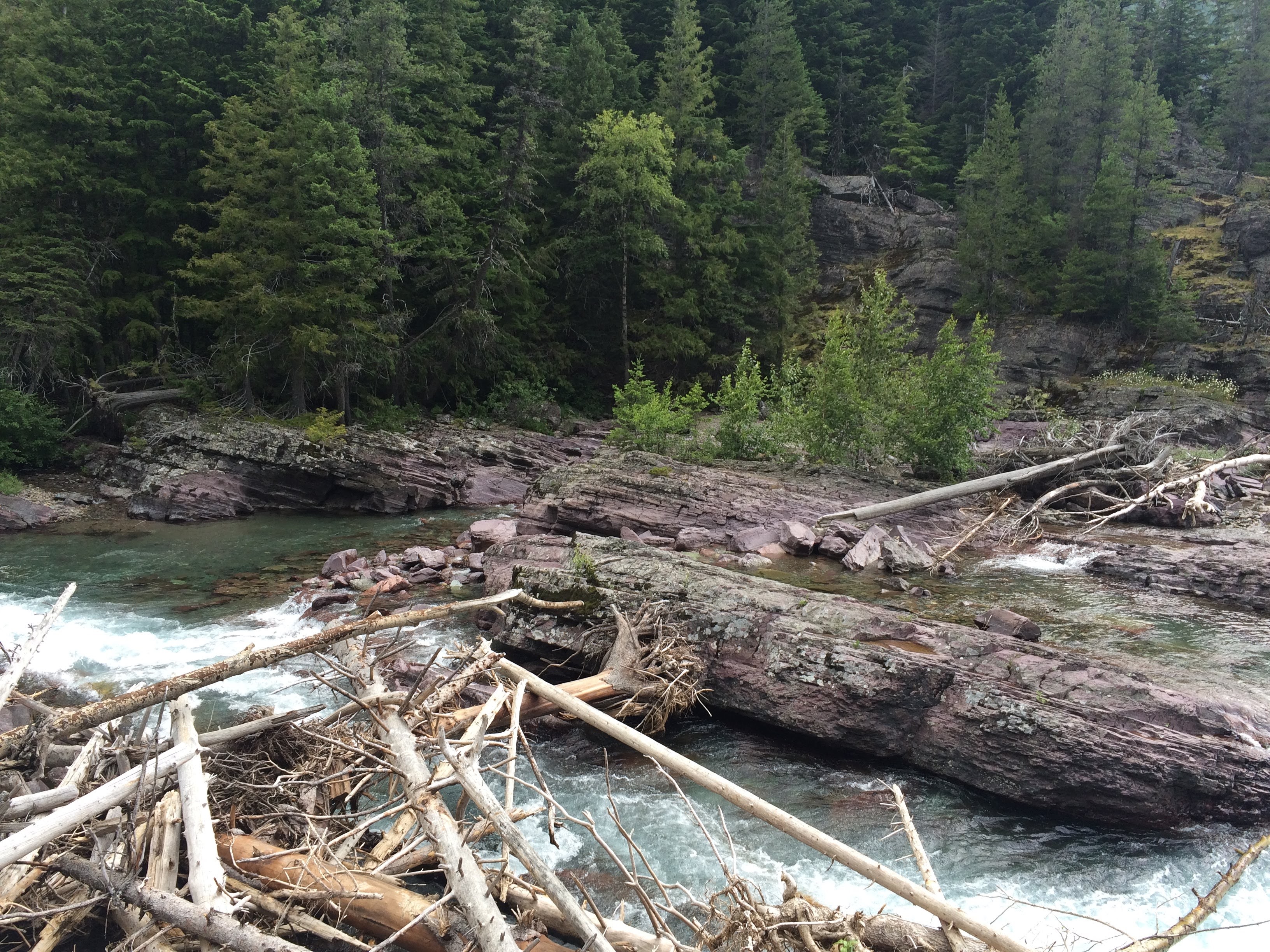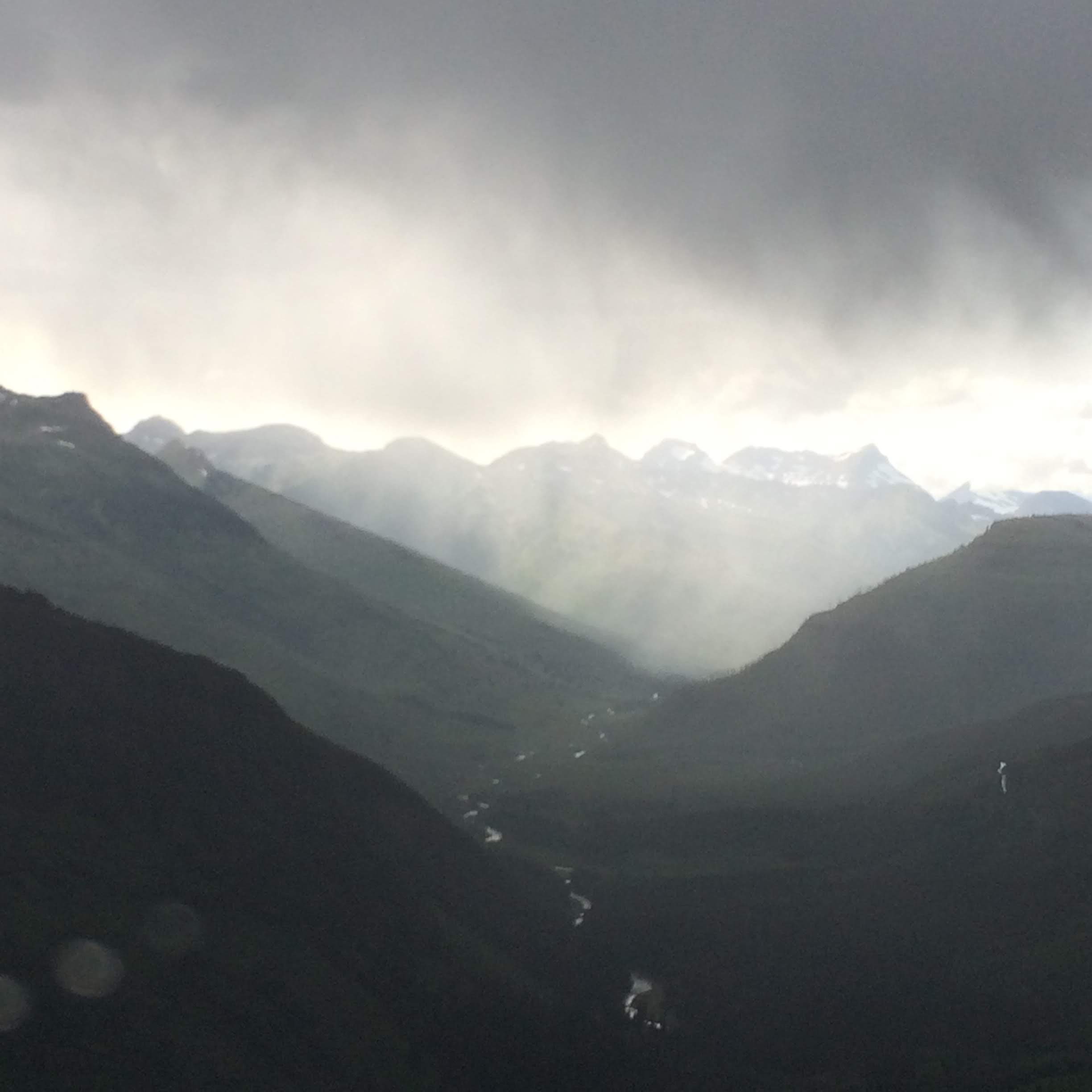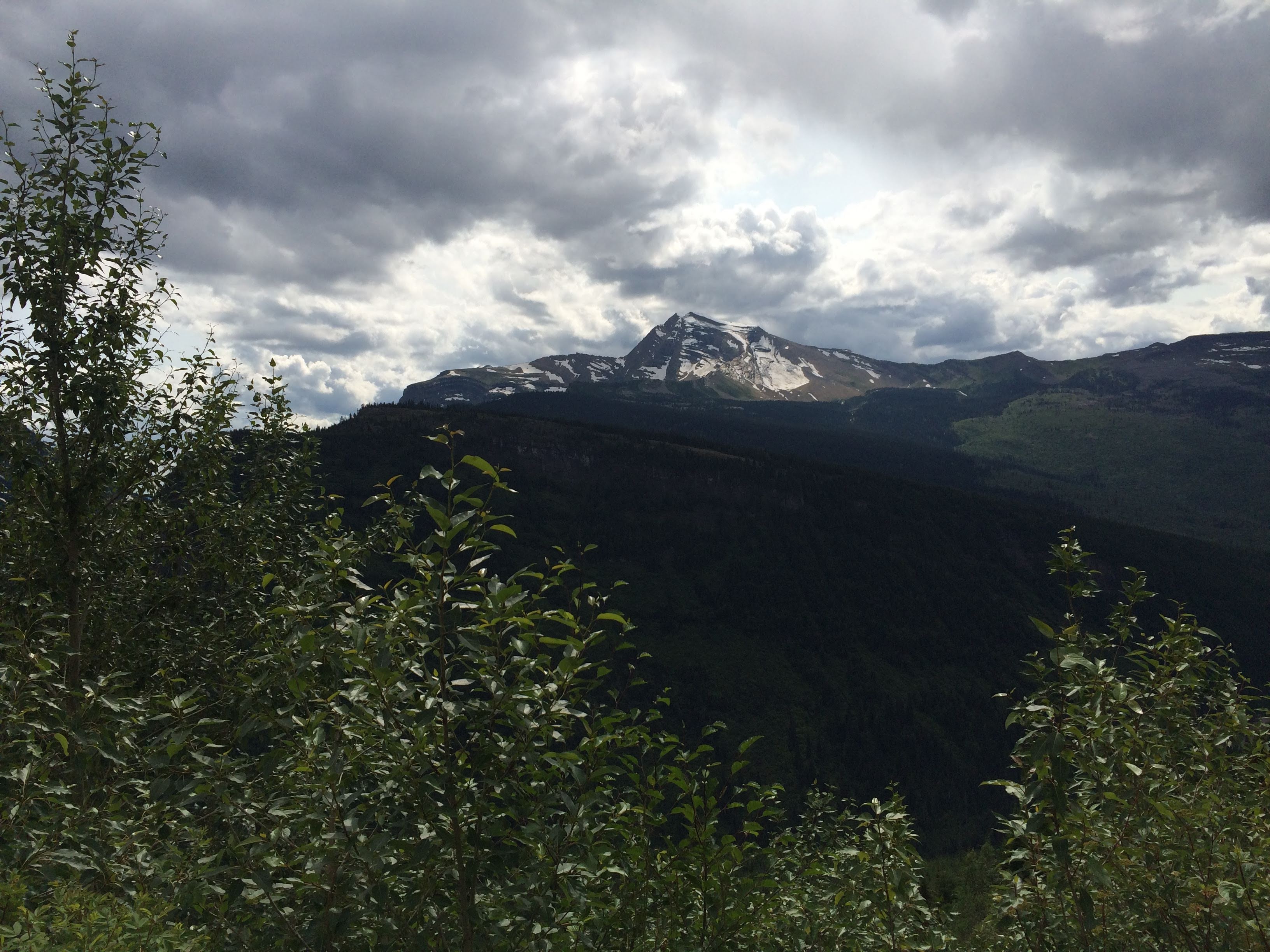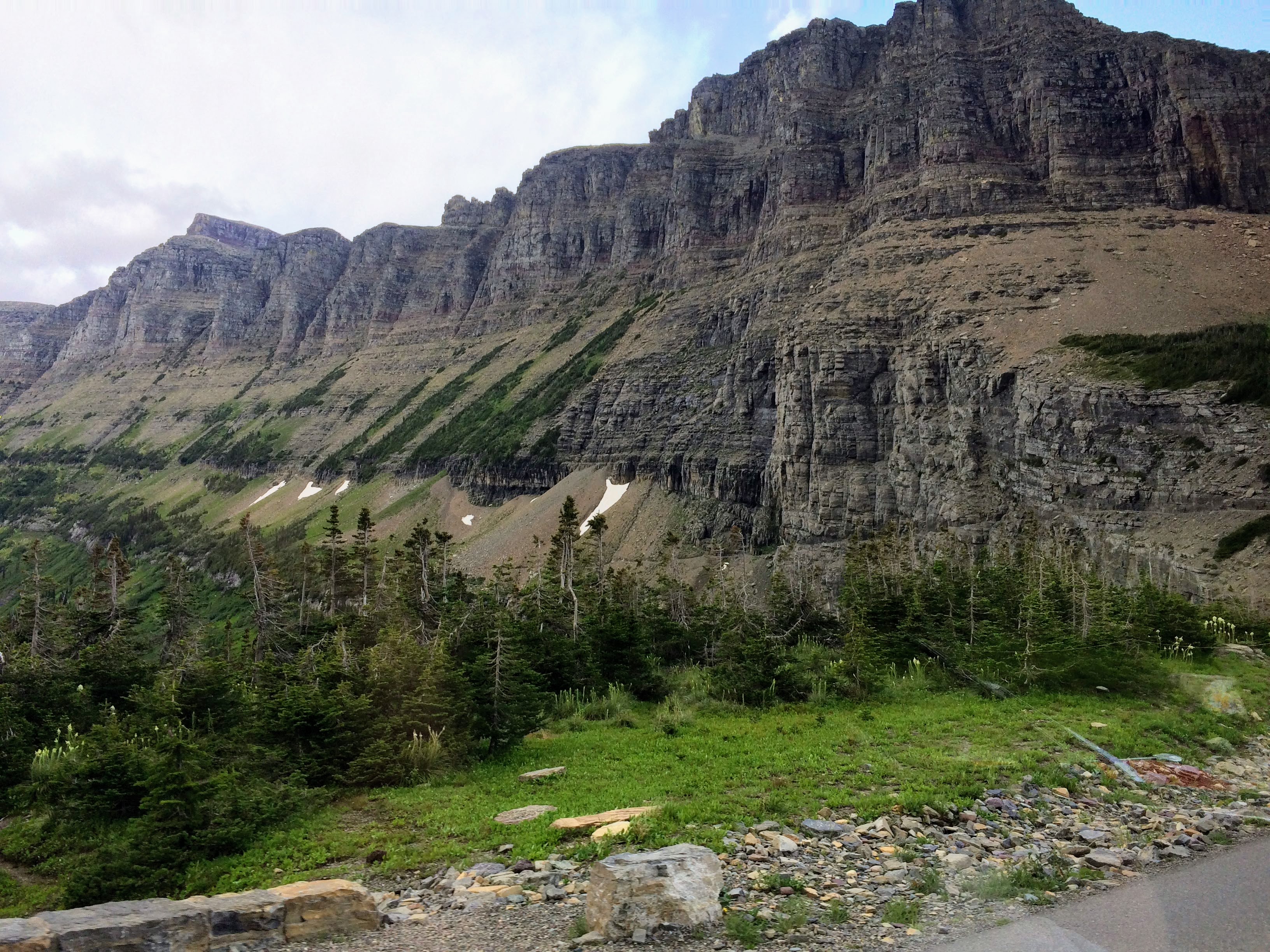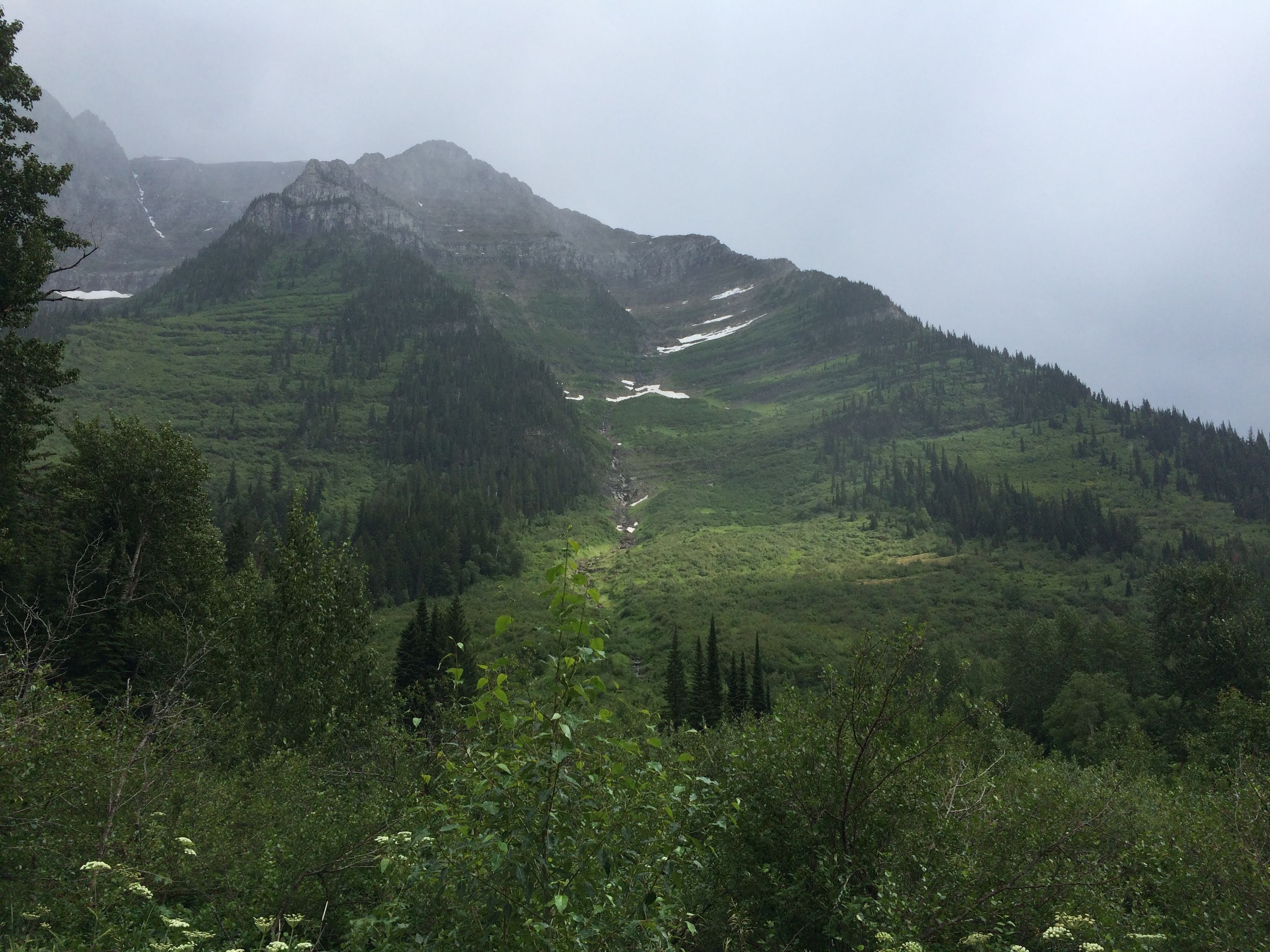 Well, the tour was slightly delayed in its start due to a sudden downpour with hail. Finally, we were allowed to get in the bus, but were given some musty blankets due to a leak in the canvas roof (it was leaking right down over where Ryan was sitting). Due to the weather, we also had to ride with the roof up most of the time, rolling it back for only a brief amount of time before it got too cold. However, the driver did do a good job giving us information about the park. Unfortunately, despite the name Glacier National Park, only 25 active glaciers are still present, and of those, most are not in places where the average visitor is able to see them. There is one that you can hike to in the east side of the park, but due to time, we would not be able to see that one. There are a couple that you can supposedly see at a couple of points of the Going to the Sun road, but the cloud cover was too thick during our visit for us to see the glaciers. Nevertheless, we did find what we could see impressive.