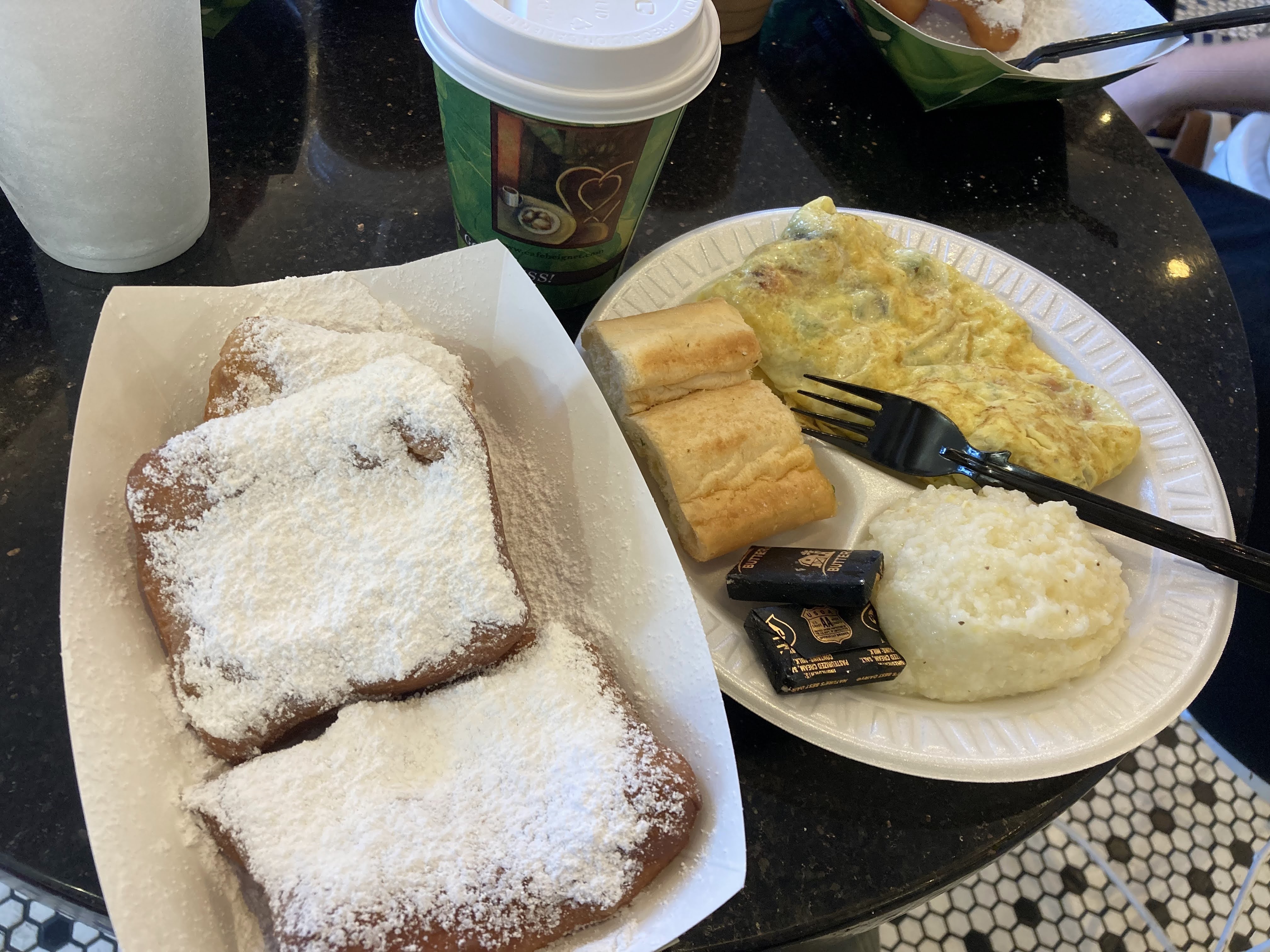 No trip to New Orleans is complete without sampling some beignets! Several of us were frequent visitors to Cafe Beignet for breakfast. Beignets are a square-shaped piece of fried dough covered with mountains of powdered sugar. It’s like eating an extremely messy, square-shaped doughnut. They are often enjoyed with a cup of cafe ole, so although I’m not normally a coffee drinker, I was in New Orleans! I had to have the full experience!
