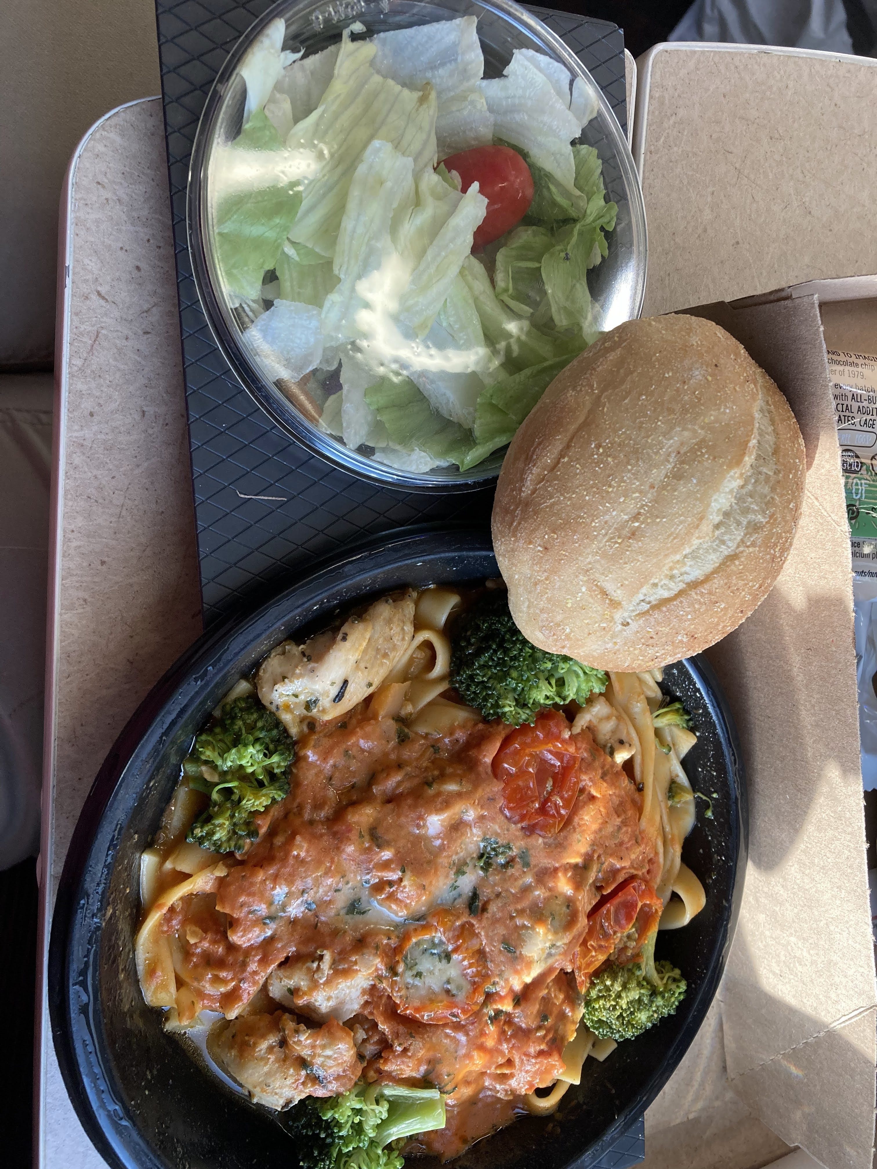 As a first class passenger, meals are also included. I have memories as a child of eating a rather fancy meal in a dining car on a train. Unfortunately, COVID affected the quality of meals served. While it sounds like the trains west of Chicago now have a full dining car again, the eastern routes still do not. The meals are a step above airplane meals, but still microwaved, rather than the fresh food you get in a true dining car experience. We tried pretty much every option on the menu during our journey as it is also the same menu for lunch and dinner. Some options were better than others. For the first dinner, Ryan and I both picked Chicken A La Rosa.
