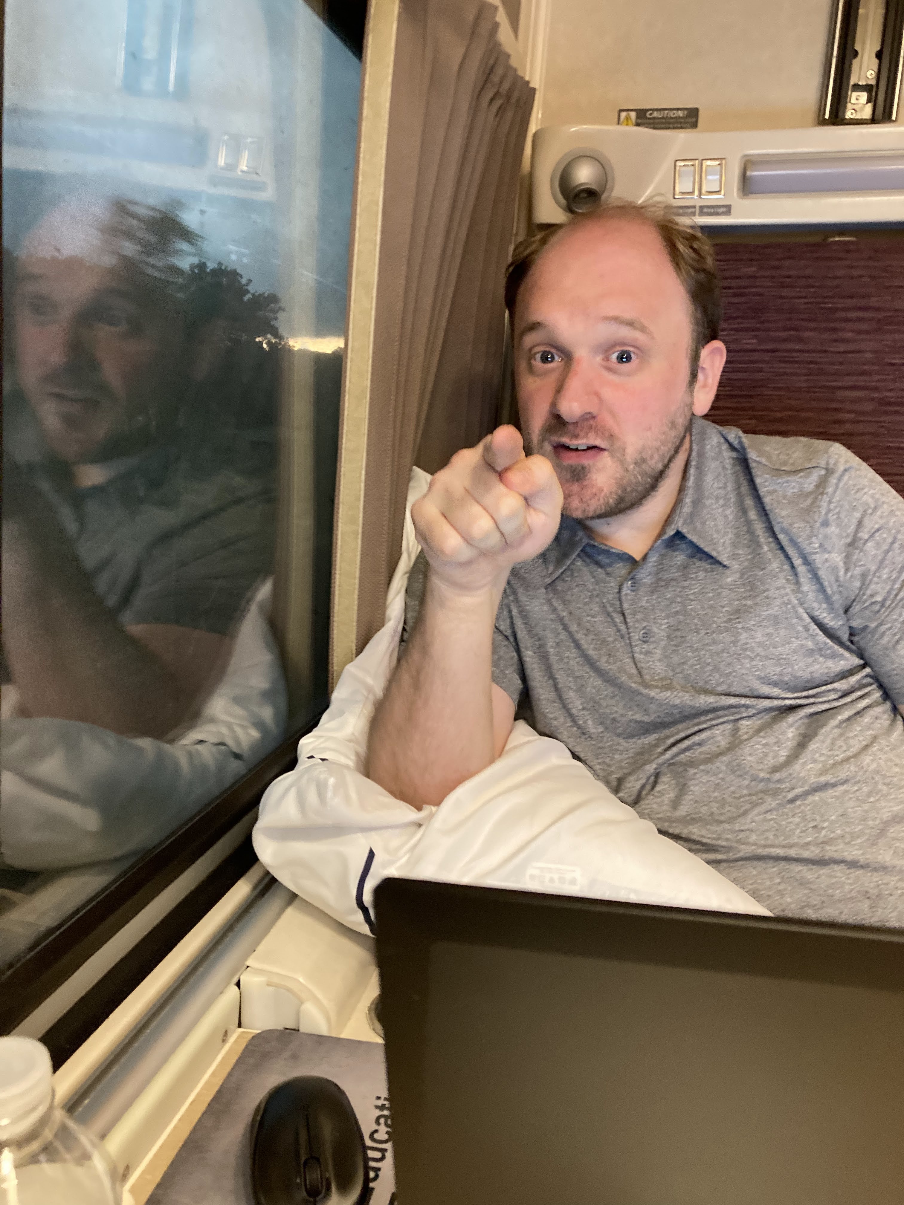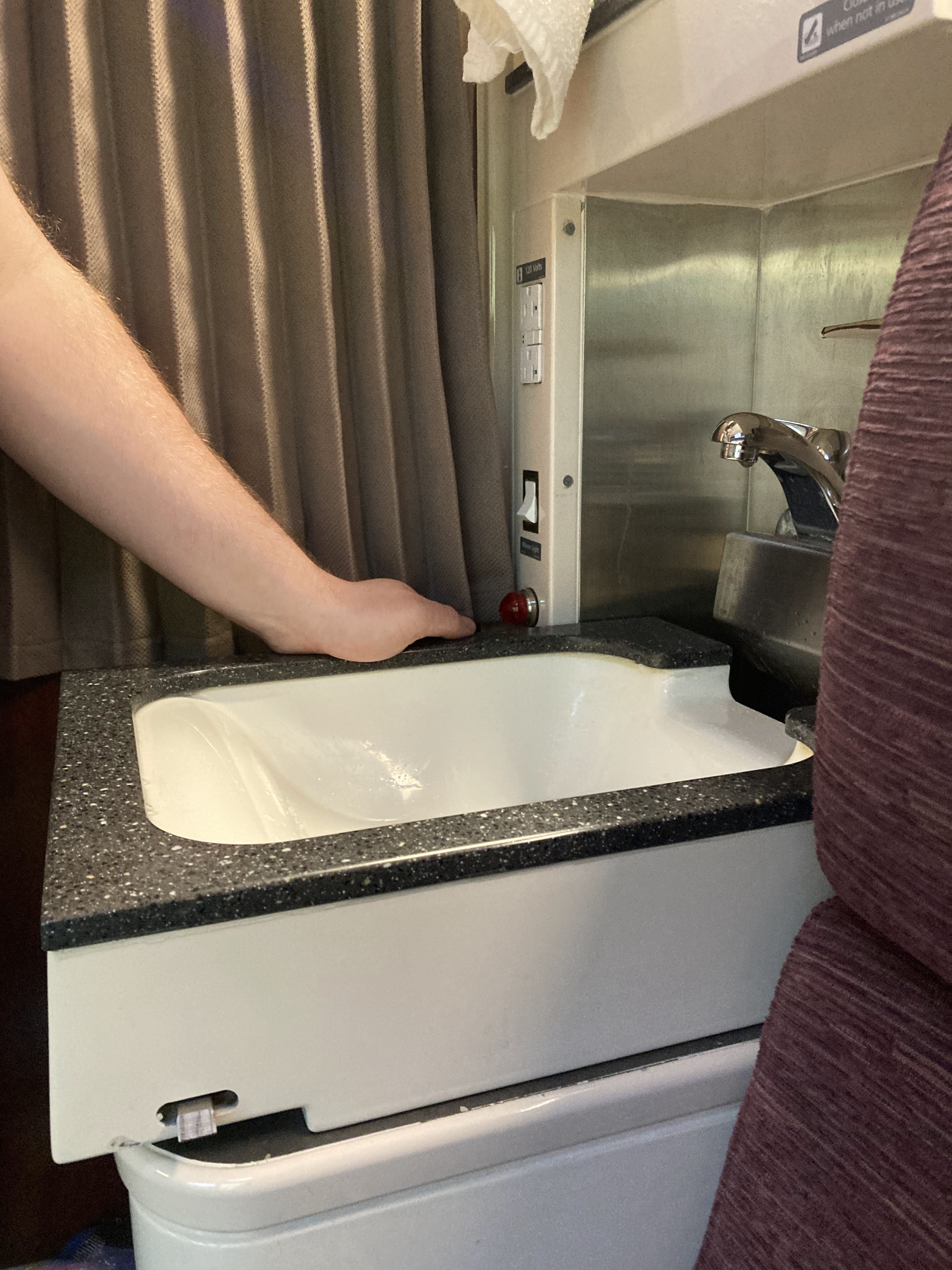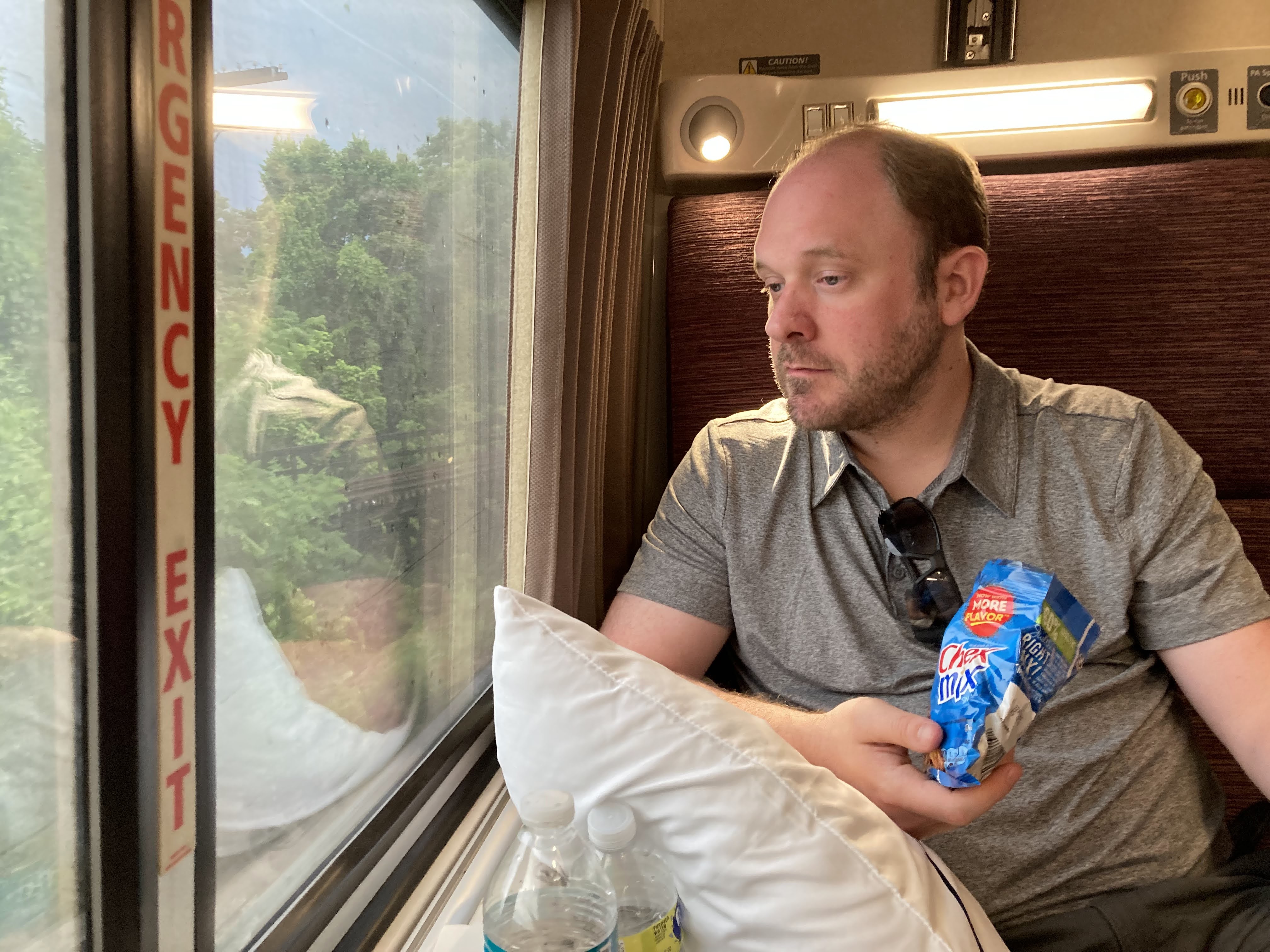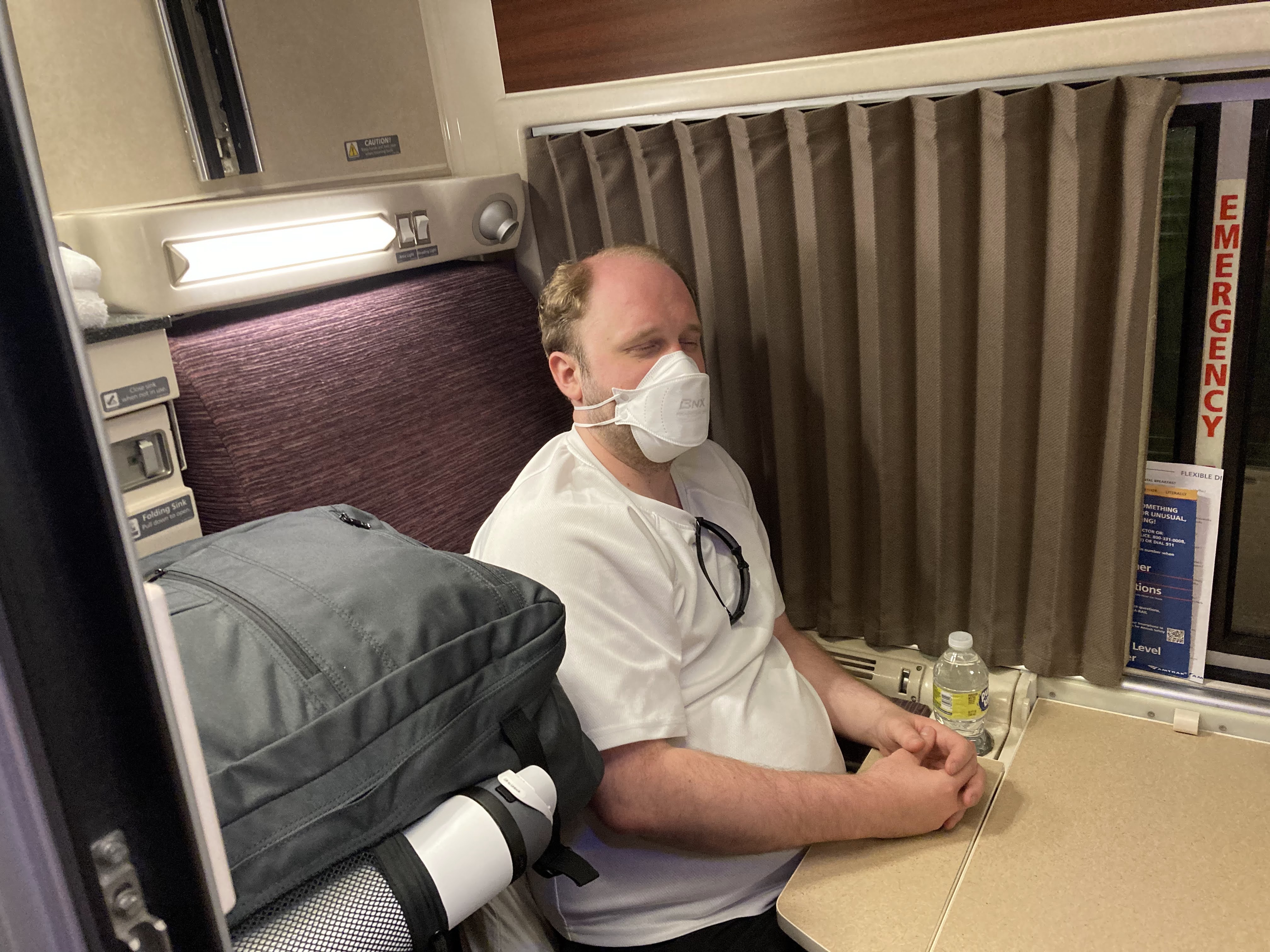On the train, we found our rooms to settle in. Ryan and I were in a “roommette,” which is the most basic kind of sleeper accommodation on an Amtrak train. It has two seats directly across from each other and a small table in the middle. At night, the chairs convert into one bed, and an upper bunk is lowered from the wall. The roommette has a sink, but no toilet or shower. The sink actually folds down from the wall. When it is folded up, it is the steps to the top bunk.