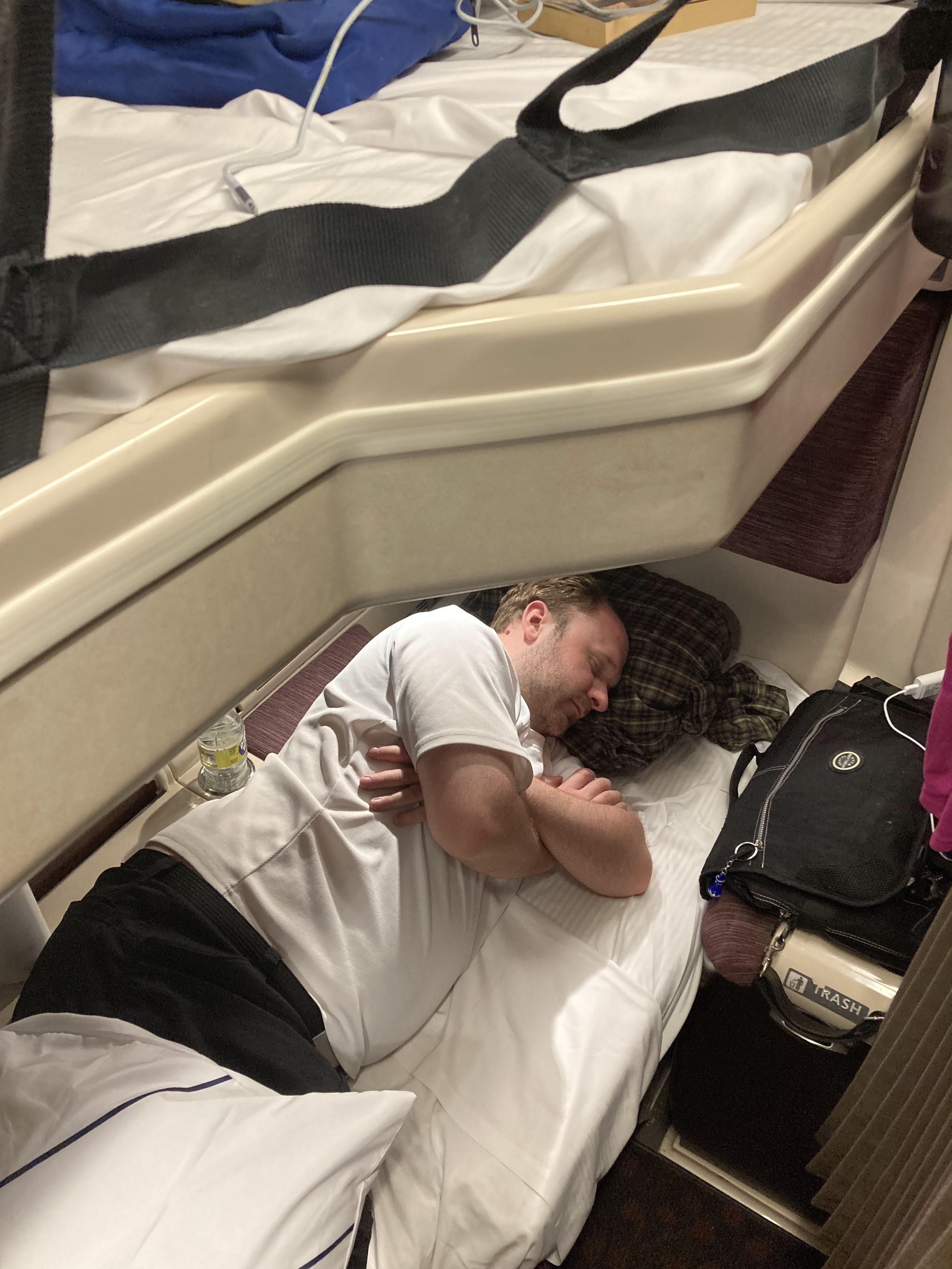 My parents were a little more fancy, opting for a bedroom. The bedroom has a little more space to spread out and also has a full private bathroom, including a shower. It still just sleeps two. There is an option for a family bedroom that sleeps four. Here you can see Ryan and I visiting with my parents in their room. It looks like three of us are sitting behind my dad, but really that is our reflection in the mirror: