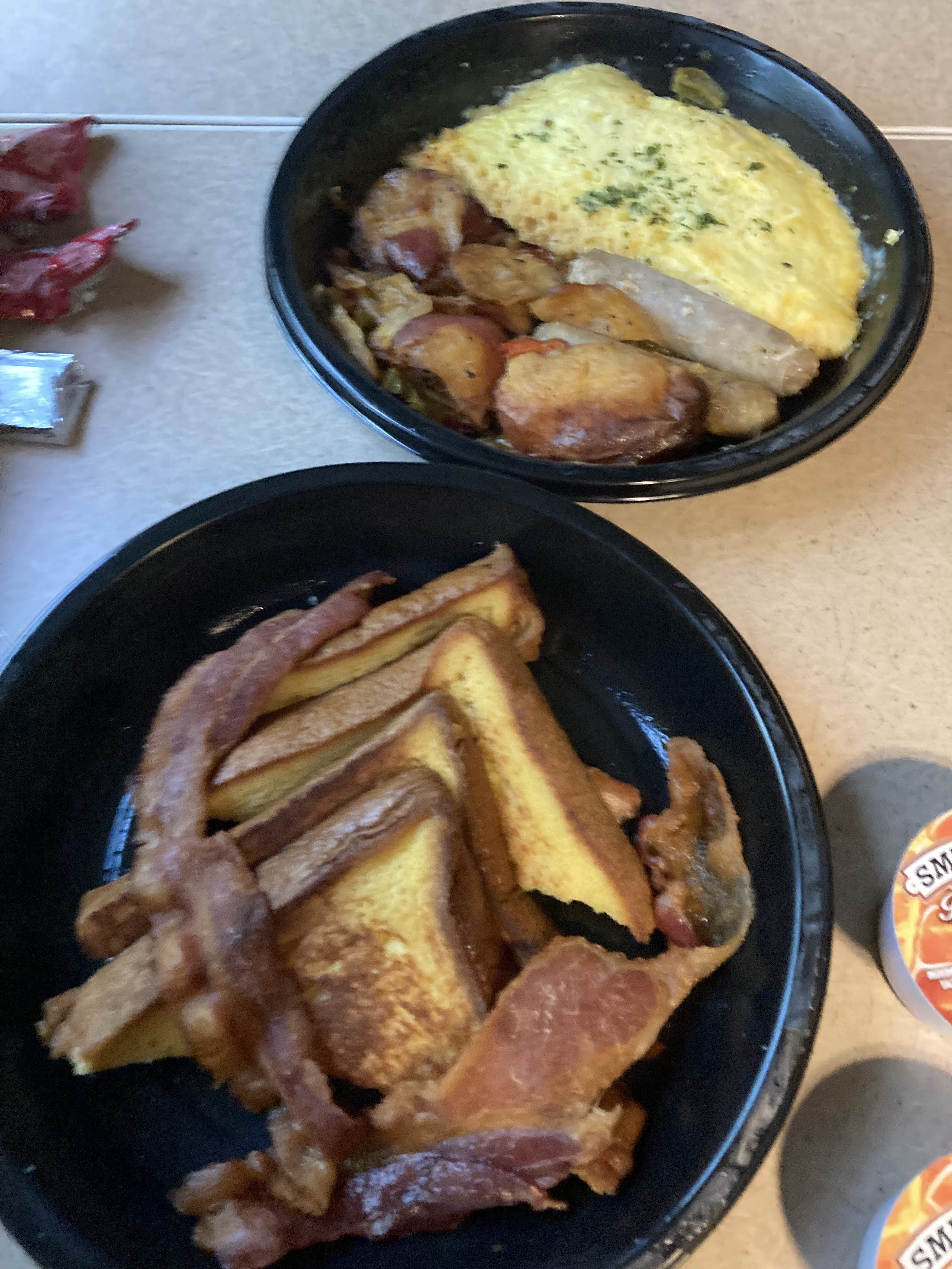 We had breakfast in our train car again after our attendant helped us convert the beds back into day mode. I ordered the Railroad French Toast, but it was pretty disappointing in its microwave version. Ryan had an omelet, and he said it was fine.